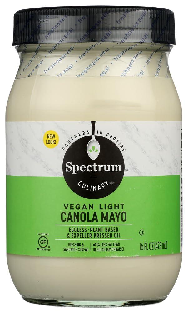 Spectrum Naturals Light Canola Mayo is made with our own expeller pressed canola oil with no hexane extraction and no preservatives added. Delicious creamy flavor- with far less fat than regular mayonnaise. Third party verified, canola oil and soy protein isolate in this product were not genetically engineered. No hydrogenated fat, sugar, corn shyrup or preservatives. Vegan & gluten free.